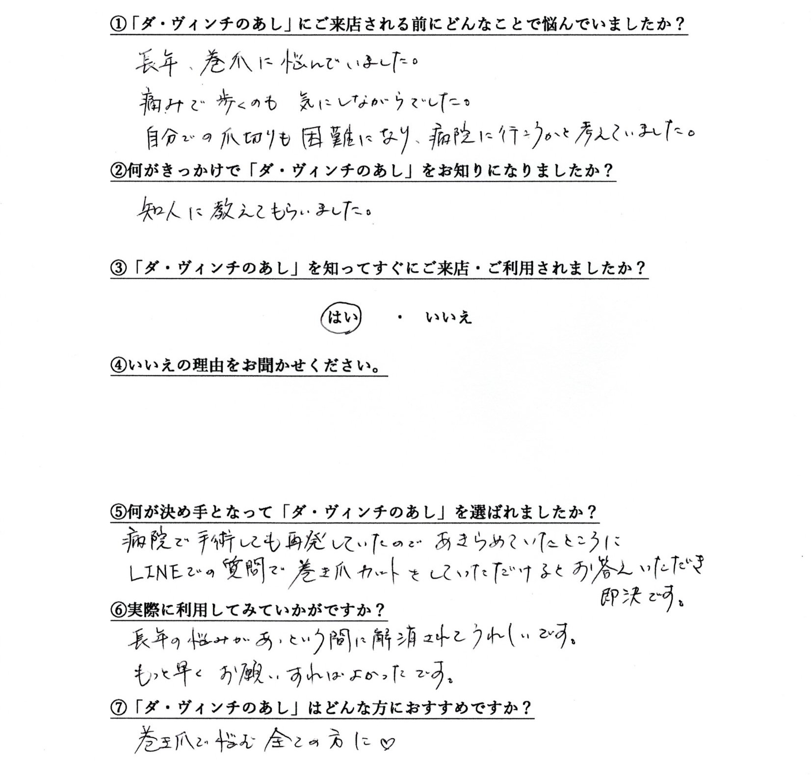病院で手術しても再発していたのであきらめていたところにLINEでの質問で巻き爪カットをしていただけるとお答えいただき即決です。