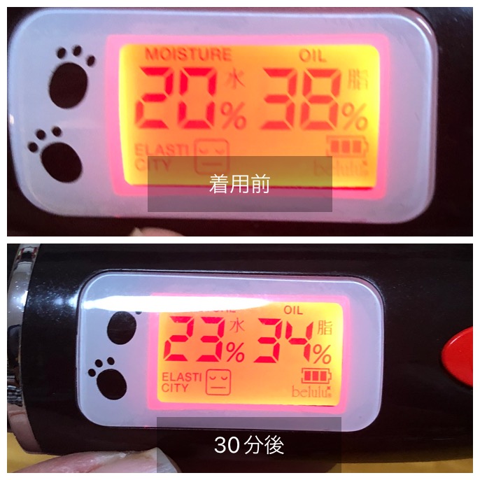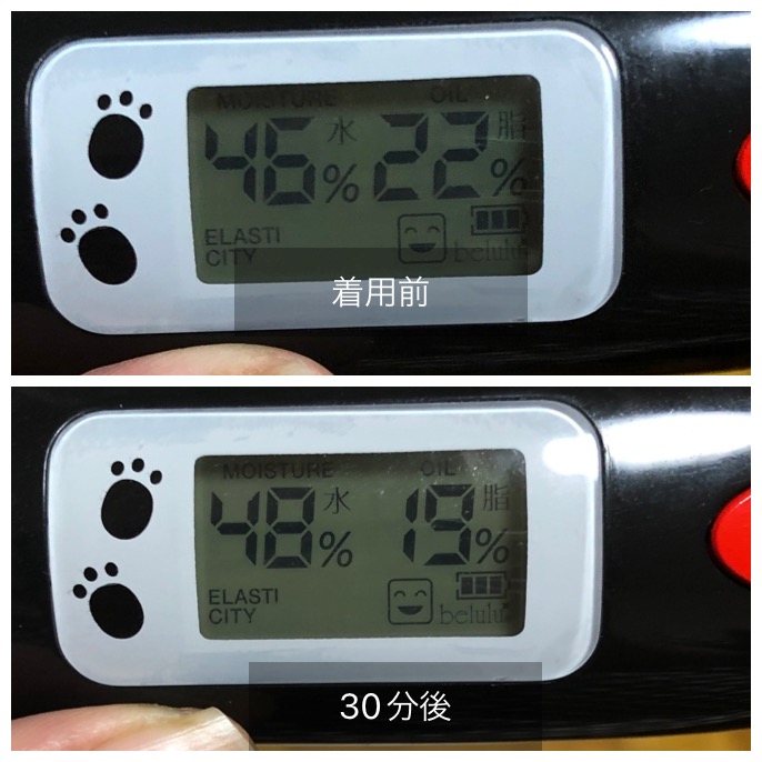 見た目では効果が伝わりにくいのでお肌の水分チェッカーで数値を計ってみました。