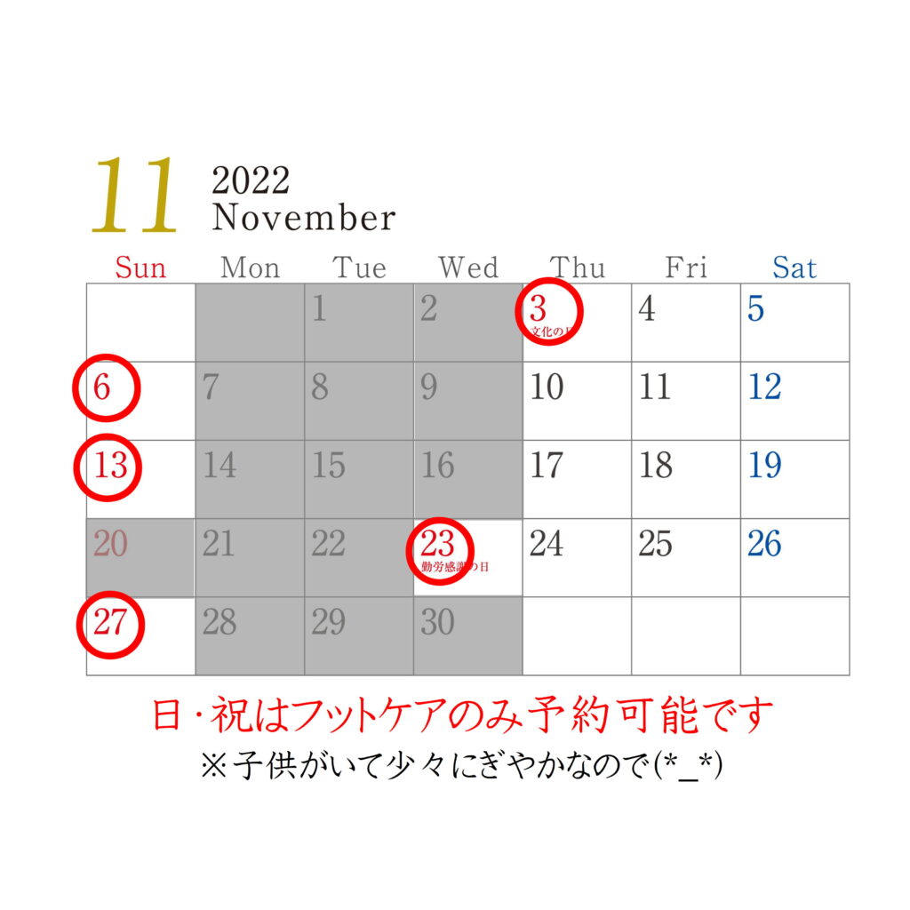 2022年11月営業日のお知らせ 2022 10/27 ニュース 2022年10月27日 ご予約はコチラ 11月より日曜・祝日のご予約も承ります。 日曜・祝日は子供達がお店にいるので、いつもよりにぎやかです。 脳洗浄足整体リラックスしたい 当てはまる方は平日・土曜日のご予約をお勧めいたします。 目次最新の投稿 移転について 2024年6月営業日のお知らせ|熊本,阿蘇,巻き爪,うおのめ,ドイツ式フットケア 2024年5月営業日のお知らせ|熊本,阿蘇,巻き爪,うおのめ,ドイツ式フットケア くるぶしの靴擦れ。原因は?解決方法は? き爪でも使えるジェルネイルはある?セルフジェルなどを検証してみた! ニュース PARAFUSE. あやしい うおのめ シューフィッター ダ・ヴィンチのあし ドイツ式フットケア フットケア外来 原因 巻き爪 巻き爪矯正 怪しい 治療 熊本 痛い 皮膚科 脳洗浄 阿蘇 魚の目 もしかして、軽い靴が体にいいと思ってませんか? 熊本市 I.C様 高校3年生「受験で悩んでいます」 関連記事 移転について 2024年5月28日 2024年6月営業日のお知らせ|熊本,阿蘇,巻き爪,うおのめ,ドイツ式フットケア 2024年5月26日 2024年5月営業日のお知らせ|熊本,阿蘇,巻き爪,うおのめ,ドイツ式フットケア 2024年4月29日 2024年3月営業日のお知らせ|熊本,阿蘇,巻き爪,うおのめ,ドイツ式フットケア 2024年2月29日 2024年2月営業日のお知らせ|熊本,阿蘇,巻き爪,うおのめ,ドイツ式フットケア 2024年1月30日 2024年1月営業日のお知らせ|熊本,阿蘇,巻き爪,うおのめ,ドイツ式フットケア 2023年12月26日 2024年1月〜価格改訂・学割・回数券始めます 2023年12月6日 2023年12月営業日のお知らせ|熊本,阿蘇,巻き爪,うおのめ,ドイツ式フットケア 2023年11月29日