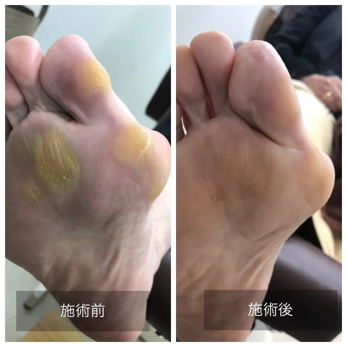 こちらのお客様の魚の目の中心が薄ら黒くなっているのですが、実は内出血の跡なんです。日常的に硬いものを踏んでいる状態ですので、圧迫されて内出血をおこしているんですね。黒い点が中心にあるときは内出血の可能性があります。 【ウイルス性のイボについてはコチラ】